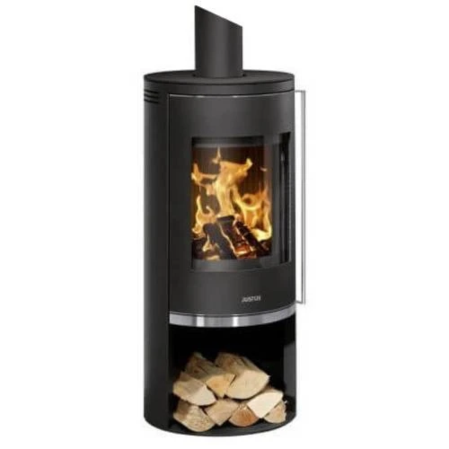 Der Kaminofen Justus Faro 2.0 lebt von seiner faszinierenden Optik. Serienmäßig wird der kompakte Säulenofen in Stahl Schwarz mit gleichfarbiger Abdeckplatte ausgeliefert, als Zusatzausstattung kann dieses Modell auch mit gussgrauem Korpus und einer Abdeckplatte aus Speckstein, Sandstein oder Kalkstein bestellt werden. Der Blickfang des Ofens sind die große Panoramatür mit getönter Sichtscheibe, die etwa die Hälfte der Gerätehöhe von knapp 115 cm einnimmt, und das offene Holzablagefach.