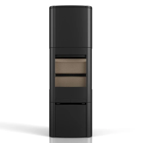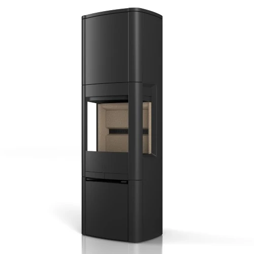 Die schwarze und graue Farbgebung des Ofens fügt sich nahtlos in jede Raumgestaltung ein. Die modernen Maße (Höhe: 1.433 mm, Weite: 490 mm, Tiefe: 382 mm) und das Gewicht von 162 kg unterstreichen seine Präsenz, ohne den Raum zu dominieren.