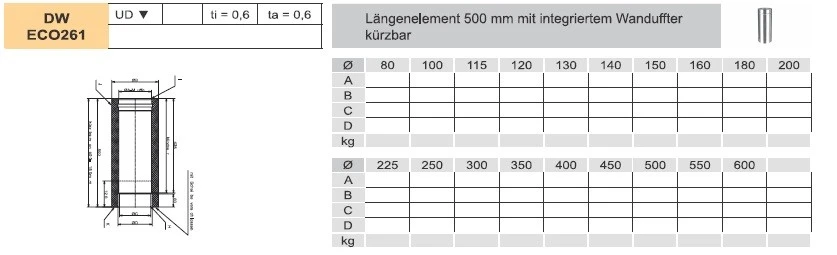 1x Längenelement 500 mm mit integriretem Wandfutter für den Edelstahlschornstein DW-ECO von Jeremias