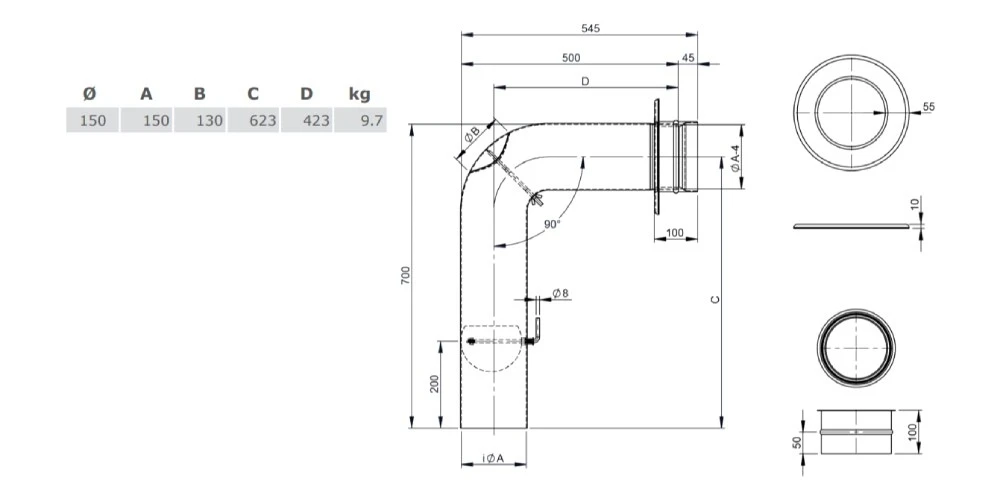 1 x Vollformbogenrohr (Schenkellänge 500/700 mm) mit Tür und Drosselklappe