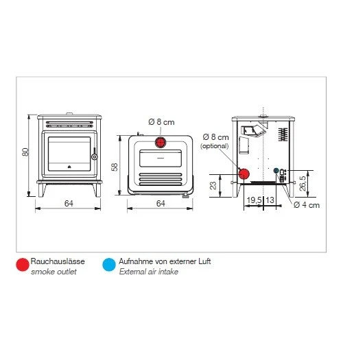 – Rauchauslass Ø 8 cm oben oder hinten. Natürliche Belüftung.