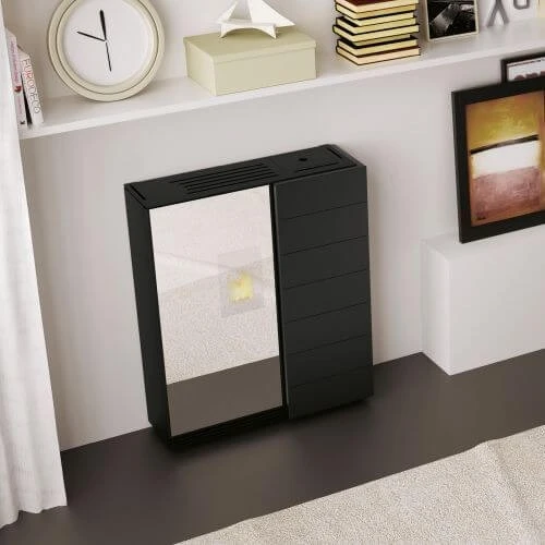 – Ästhetische Tür aus Spiegelglas, die bei angezündetem Ofen die Sicht auf die Flamme ermöglicht.