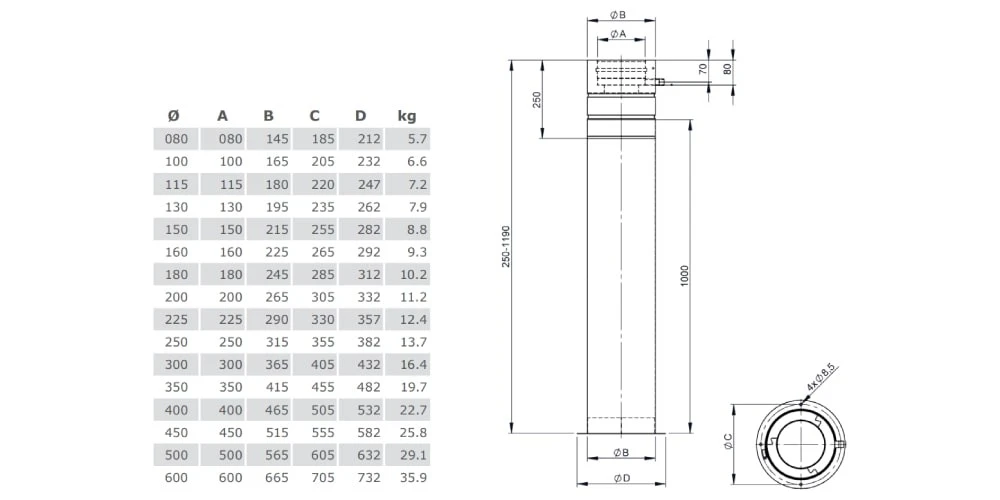 1 x Teleskopstütze 250-1190 mm inkl. Teleskopkopf mit Kondensatablauf seitlich- doppelwandig – Jeremias DW-FU